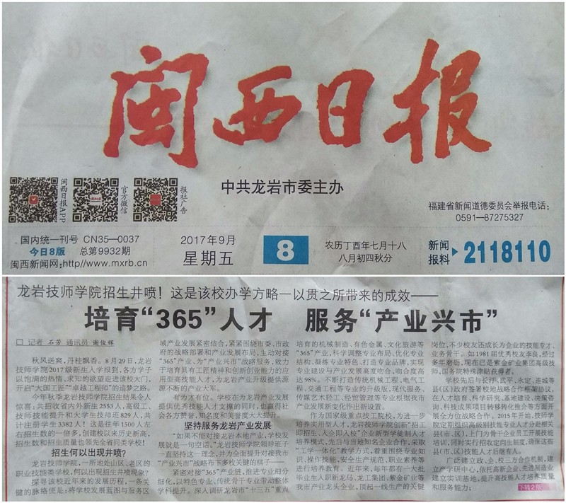 【闽西日报】龙岩技师学院培育“365”人才 服务“产业兴市”