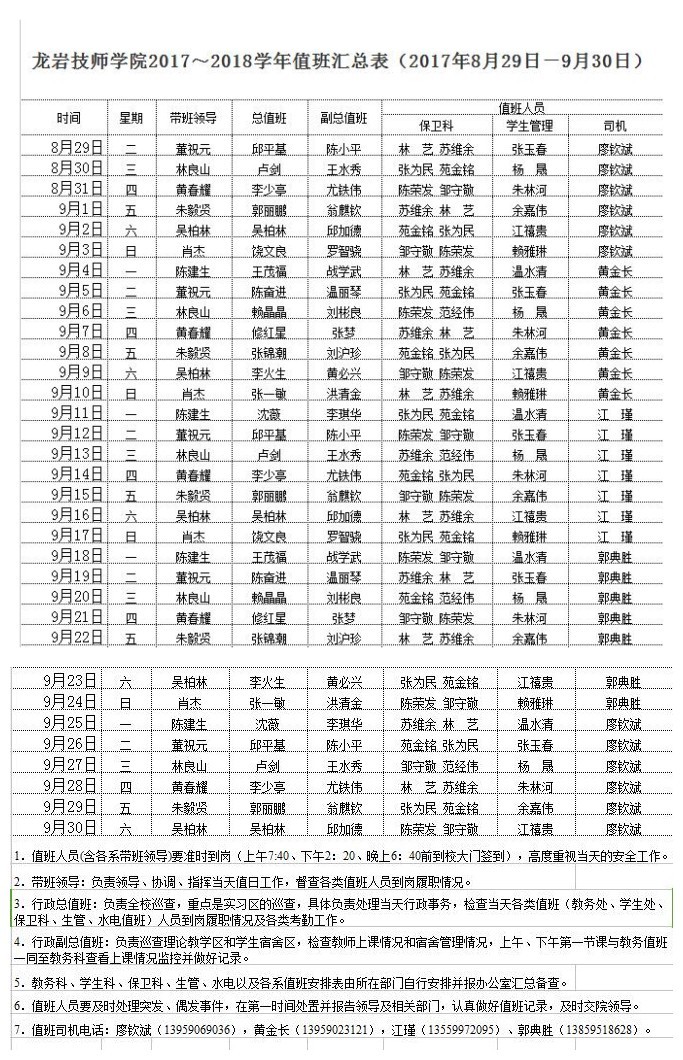 2017~2018学年值班汇总表(2017年8月29日-9月30日)