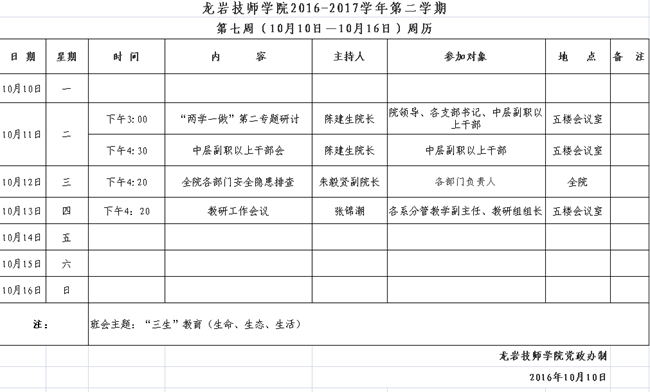 龙岩技师学院2016-2017学年第二学期第七周(10月10日—10月16日)周历