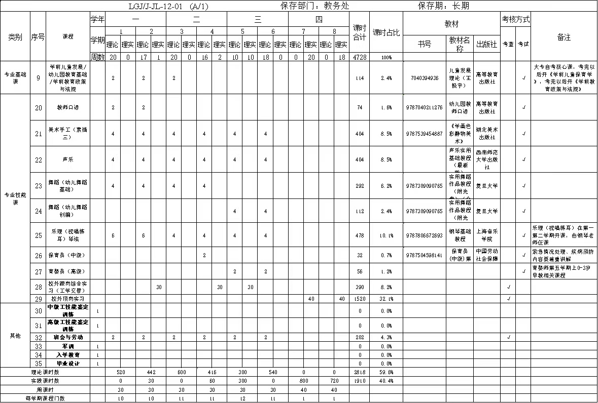 三学年校内学习,第三年第一学期的跟班教育实习,第四学年的顶岗教育实习。第一学年重点加强公共基础、专业基础知识的学习和专业单项技能的训练,提高学生的文化修养,让学生对职业有初步的感性体验,增强对幼教专业的认同。第二学年主要是核心课程、教育教学法和技能的学习训练及职业道德的培养,增强学生的核心能力。第三学年,主要是教育教学法,技能的实践运用,跟班教育实习,增强学生的实践能力。第二学年进行保育员中级技能鉴定,第三学年进行育婴员高级技能鉴定。