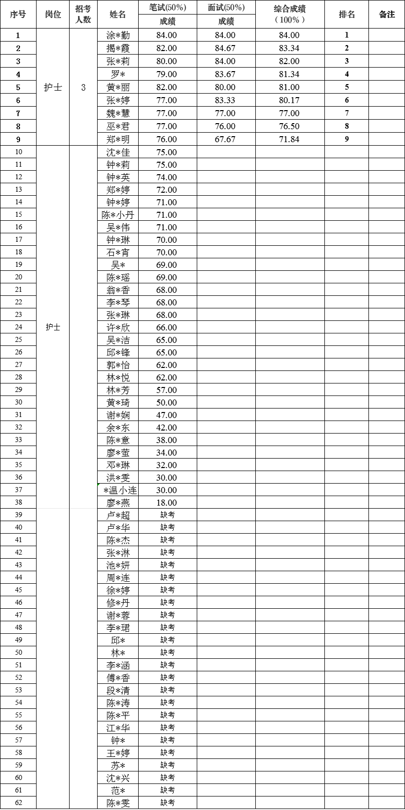 龙岩技师学院公开招聘编外工作人员综合成绩和排名公告