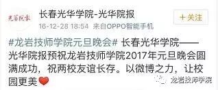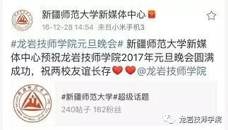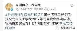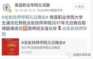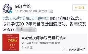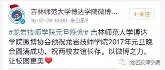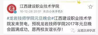 我院官方微信公众号立足服务师生,关注校园动态,不断创新,积极传播校园正能量,官微朋友圈不断扩大,得到了兄弟院校的关注和粉丝们的支持。在我院举行的2017年元旦文艺晚会上,全国四十所高校发来微博贺电。本次晚会通过龙岩技师学院新浪微博全程直播,视频播放量突破70000余次。
