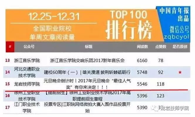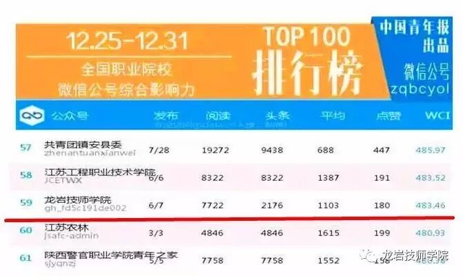 日前,在中国青年报最新一期的【全国职业院校微信公众号排行榜】中,龙岩技师学院官方微信公众号在全国职业院校综合影响力排名第59位、福建省第1,单篇文章阅读量在全国职业院校排名第15位。