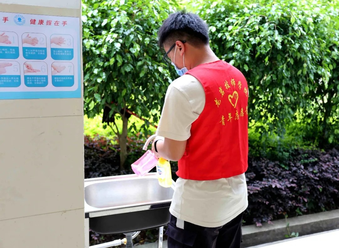 志愿者定期为各个班级门前的洗手台更换洗手液