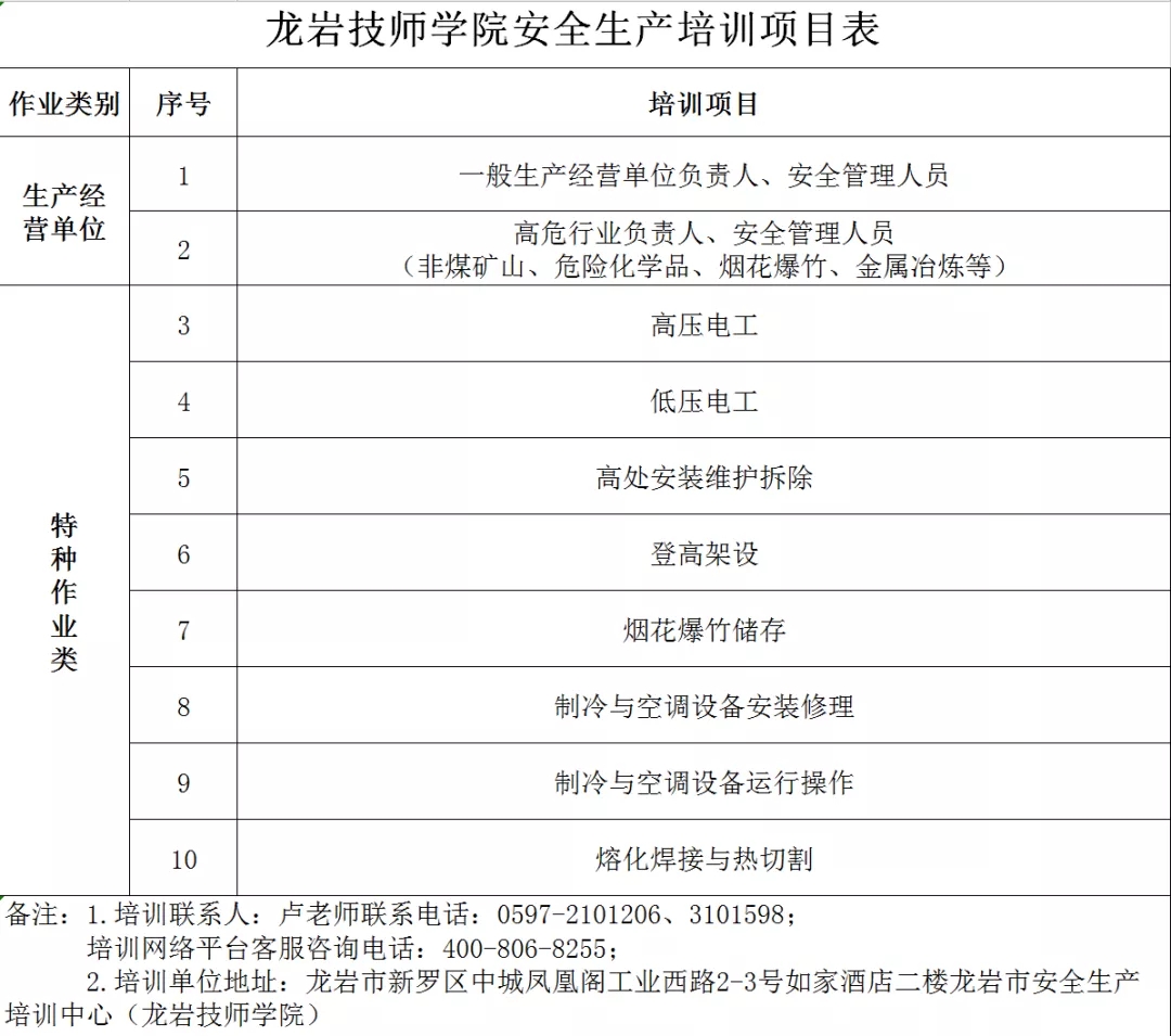 为支持企业做好复工复产工作,贯彻落实全国“安全生产月”和“安全生产万里行”活动精神,龙岩技师学院决定在疫情防控期间对生产经营单位主要负责人和安全生产管理人员初培、复审和换证以及特种作业人员复审和换证等安全生产在线课程进行免费培训,同时提供对应课程在线练习、在线模拟考试等配套服务,以实际行动支持企业复工复产以训稳岗。