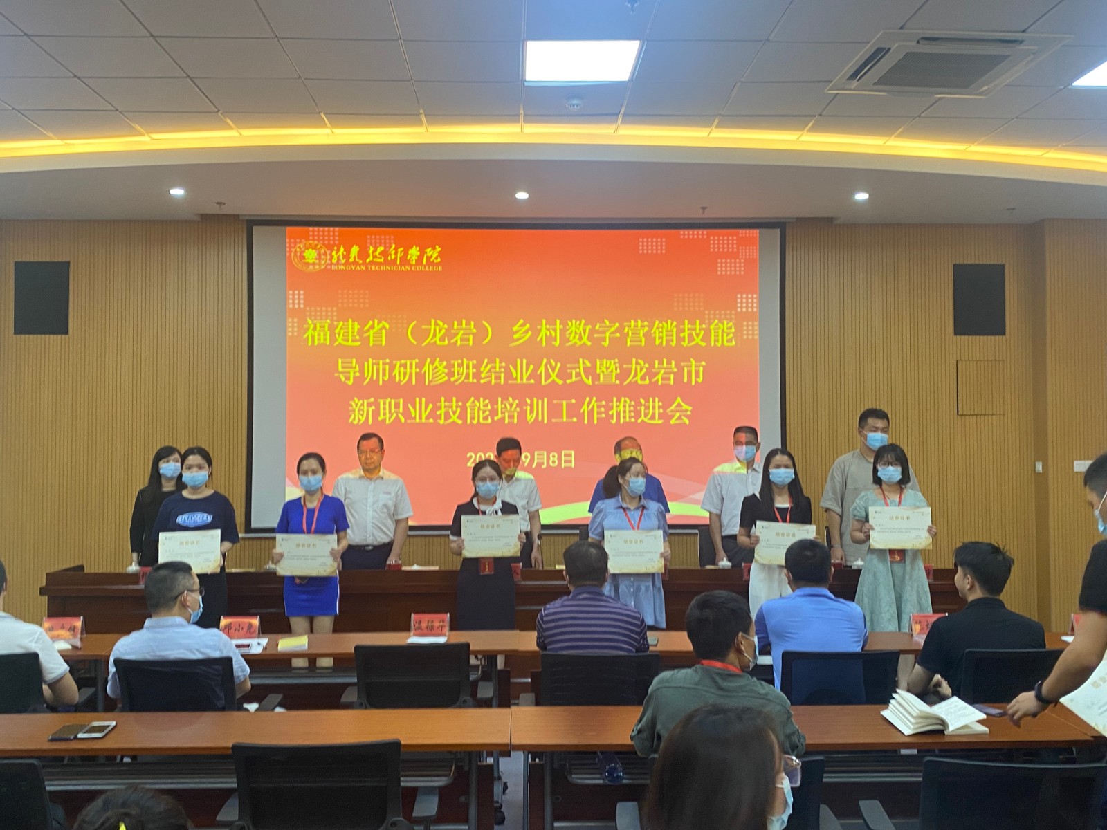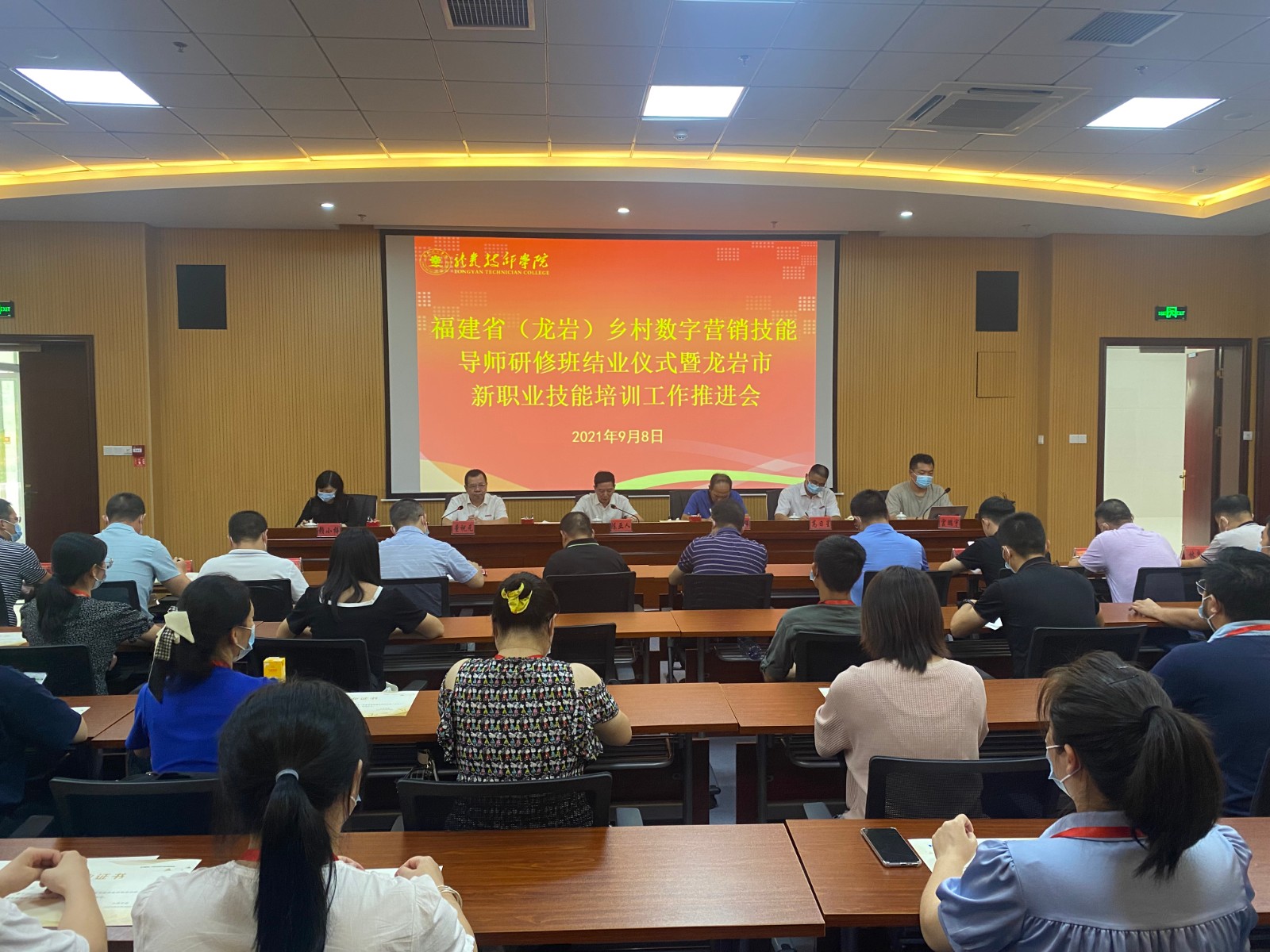 9月8日,福建(龙岩)乡村数字营销技能导师研修班结业式暨龙岩市新职业技能培训工作在龙岩技师学院校本部多功能厅举行。市人社局局长陈亚人,市人社局三级调研员范伯群,龙岩技师学院副院长高日星以及北京字节跳动相关人员出席会议,市人社局、龙岩技师学院、头条学堂相关负责人员以及此次培训人员参加会议。会议由龙岩技师学院常务副院长董祝元主持。